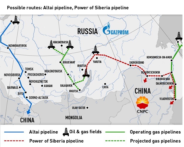 Trase će voditi od Sibira, a to Kini treba da obezbedi 38 milijardi kubnih metara prirodnog gasa godišnje u narednih 30 godina. Prva faza izgradnje gasovoda preko istočne trase već je počela u maju 2015. Dva energetska gasna džina su ušla u pregovore da izgrade gasovod i preko zapadne maršute.
