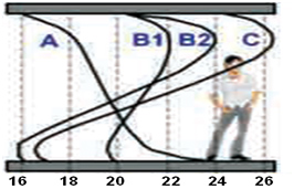 Kriva “B1” prikazuje raspored temperature kada je radijator ispod prozora na spoljnjem zidu. U ovom slučaju, temperaturna raspodela po visini, u celom prostoru je oko 20°C. Kriva “B2” prikazuje raspored temperature kada je radijator na unutrašnjem pregradnom zidu. U ovom slučaju imamo neprijatan doživljaj vrelih obraza i hladnih nogu. Kriva “C” prikazuje raspored temperature kada je u pitanju grejanje toplim vazduhom koji se uduvava u prostor sa plafona. Ovo je najgora varijanta koja izaziva veoma veliku neprijatnost, a doživljavamo je kao vruću glavu (25°C) i hladne noge (17°C).