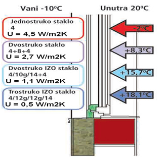 Ilustracija pokazuje da se sa povećanjem broja stakala u prozoru, kao i ispunom međuprostora između stakala inertnim gasom, mogu postići ogromne uštede energije za grejanje.