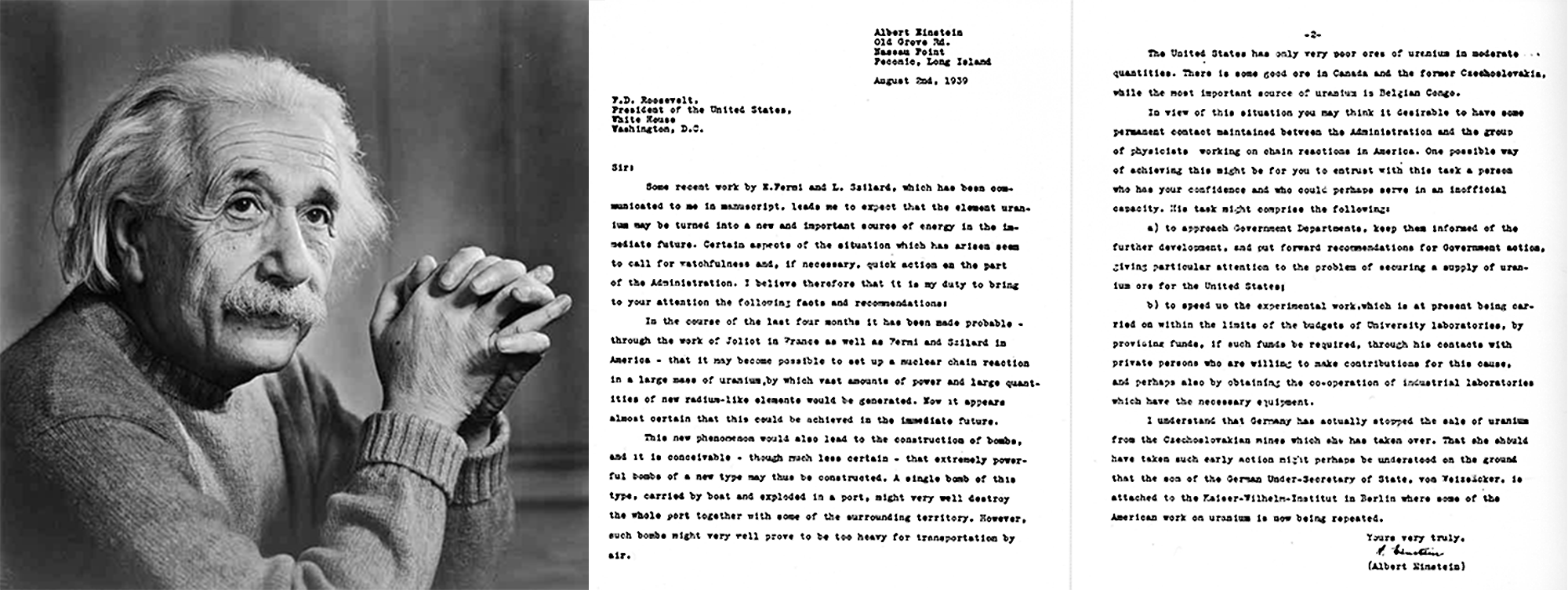 Mesec dana pre početka Drugog svetskog rata, Albert Ajnštajn je napisao pismo predsedniku SAD Frenklinu Ruzveltu, kojim je umnogome uticao na stvaranje atomske bombe. Ajnštajn, osvedočeni pacifista koji je pobegao iz nacističke Nemačke, saznao je da su trojica fizičara u Berlinu, predvođeni nobelovcem Wernerom fon Hajzenbergom, na pragu stvaranja oružja koje će iz korena promeniti odnos snaga u ratu. Prema njegovim rečima, nemački naučnici uspeli su da nuklearnom fisijom uspešno „pocepaju“ atom uranijuma.